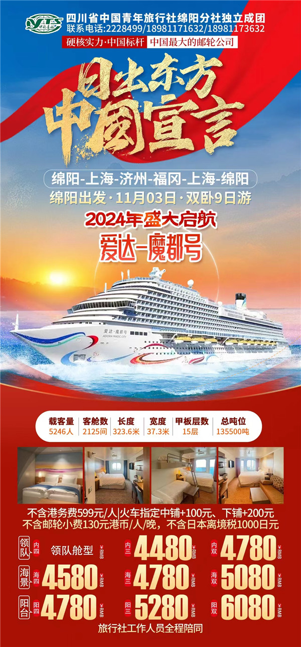 綿陽中旅假日旅行社于2024年10月9日在市工會(huì)大廈成功舉行“愛達(dá)·魔都號(hào)豪華郵輪9日游”旅游線路推薦會(huì)?,F(xiàn)場主持人向到場的嘉賓們詳細(xì)的介紹了濟(jì)州、福岡等地的風(fēng)土人民、美食、美景以及出游的相關(guān)注意事項(xiàng)等內(nèi)容,受到了嘉賓們的熱烈歡迎和關(guān)注。服務(wù)熱線:0816-2228499/2238477 。